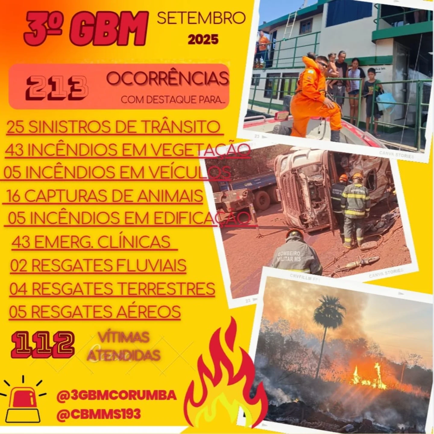 O 3º Grupamento de Bombeiros Militar de Corumbá (3º GBM) registrou 213 ocorrências ao longo de setembro de 2025. As ações envolveram desde acidentes de trânsito até incêndios em vegetação, além de resgates terrestres, aéreos e fluviais.