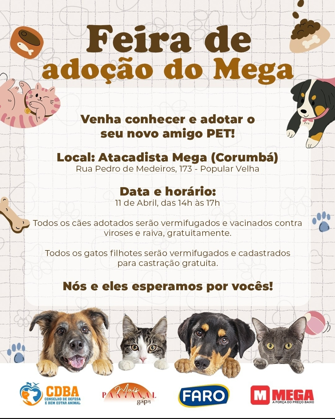A população de Corumbá terá uma nova oportunidade de adotar um animal de forma responsável durante a Feira de Adoção do Mega, marcada para este sábado, 11 de abril, das 14h às 17h, no Atacadista Mega, localizado na Rua Pedro de Medeiros, 173, no bairro Popular Velha.