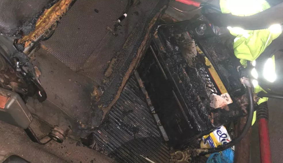 No local, os bombeiros encontraram um homem de 67 anos que realizava um ajuste na conexão da bateria do caminhão que conduzia. Durante o procedimento, houve respingos da solução da bateria, atingindo rosto, pescoço e parte do tórax, causando queimaduras de primeiro grau, principalmente na face. A vítima estava consciente, mas apresentava forte ardência nos olhos.