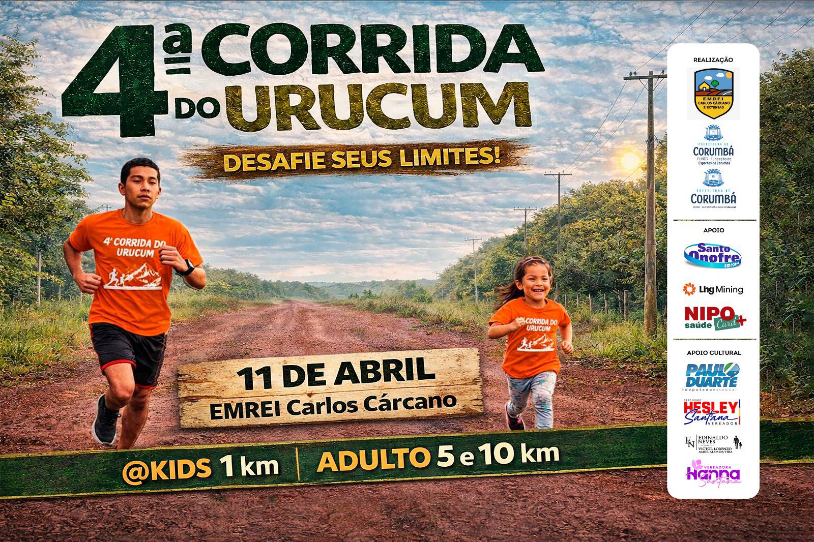 A EMREI Carlos Cárcano e Extensão Castro Alves, localizada no Assentamento Urucum, na zona rural de Corumbá, realiza neste sábado, 11 de abril de 2026, a 4ª Corrida do Urucum, evento esportivo que une atividade física, integração comunitária e apoio direto à educação.