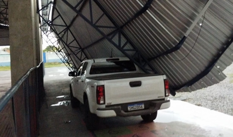 Parte da estrutura da quadra do Colégio Salesiano de Santa Teresa desabou sobre um veículo estacionado no local, gerando prejuízo material. Não houve feridos.