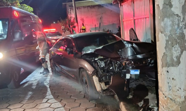 A colisão aconteceu na rua Domingos Sahib, onde um veículo de passeio acabou atingindo um poste de iluminação pública. O impacto foi extremamente forte, deixando a parte frontal do automóvel completamente destruída.